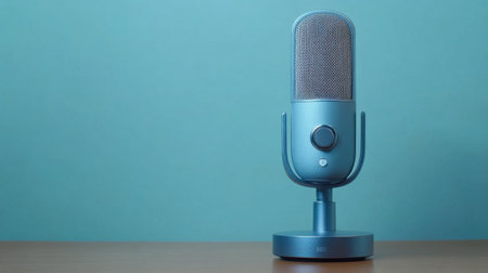 A chic blue microphone placed on a wooden table against a soft teal background, perfect for podcasting, streaming, or recording audio content professionally.