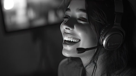 Woman in headset, laughing slightly while engaging in a call, showing a genuine, approachable attitude. Background subtly blurred.