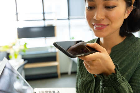Smiling asian female architect talking on smart phone in creative office. Unaltered, creative business, design professional, technology, communication, voicemail, speech recognition.