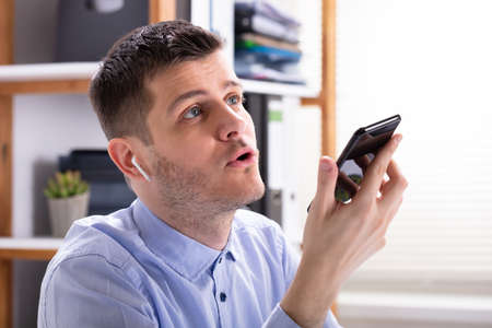 A confident guy is recording voice message, a young man is using voice assistant on the smartphone. A man is talking in the phone microphone, close-up