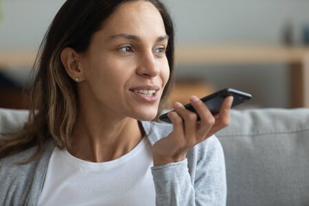 Young smiling business woman using vocal or voice activated digital assistant in smartphone, close up.