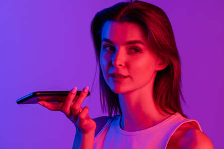 woman using voice recognition on smart phone to record messages. Woman speak and activate virtual digital voice assistant on smartphone.