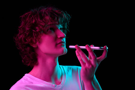 Record voice message. Young handsome boy using smartphone isolated on blackbackground in neon light, filter.