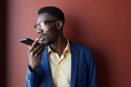 Portrait of elegant African-American man recording voice message via smartphone and wearing glasses while posing against maroon background, copy space