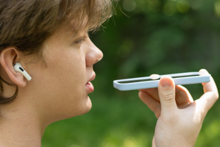 Young woman with wireless headphone is using her smartphone to send a voice message to a new social network Clubhouse standing somewhere outdoors at the park