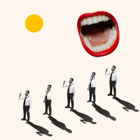 Creative painting collage artwork postcard poster of showman actor artist arm near face beard answer question isolated on drawing background