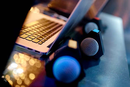 three microphones lie next to the laptop on the table in the karaoke bar. High quality photo