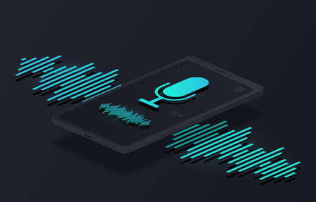 Voice recognition concept. Microphone, recording. Modern technologies and innovations. Special applications for voice input and searching for information on Internet. Isometric vector illustration