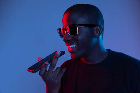 Portrait of smiling, young african woman recording voice message on phone against cyan, blue studio background in neon light. Communication