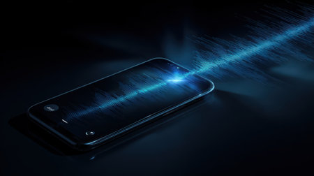 Smartphone with Blue Sound Wave Visual Effect Isolated on Dark Background, Digital Communication Concept Representing Sound Technology and Modern Devices