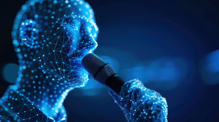 A captivating digital representation of a singer performing with a microphone, depicted in a blue wireframe style against a neon backdrop, symbolizing technology and music.