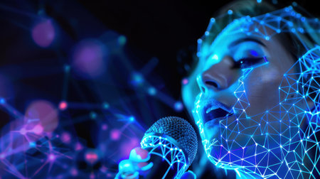 A captivating image of a singer immersed in performance, enhanced with vibrant digital effects and network visuals, showcasing the blend of art and technology.