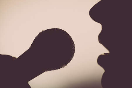 Close up image of a silhouette of a woman singing to a microphone.