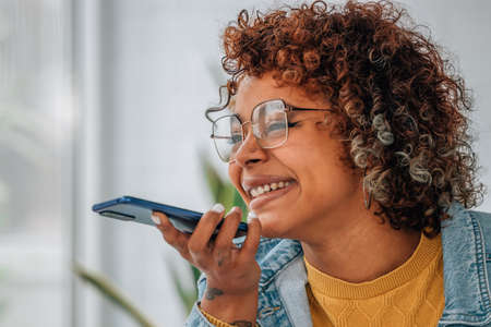 Young Woman Using Voice Recognition Function On Mobile Phone