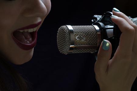 Singer in front of a microphone. Isolated on a dark background.