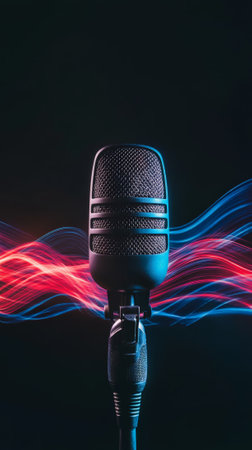Professional microphone capturing colorful sound waves, representing music recording, voice recording, singing, podcasting, and audio production in studio or live settings