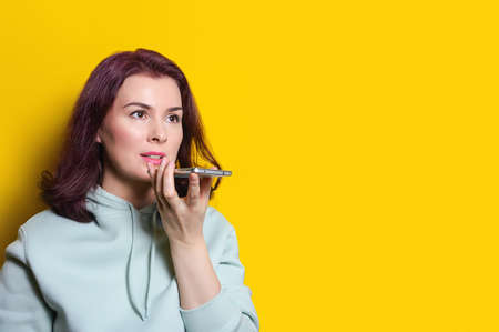 young woman is recording an audio message on her smartphone. Horizontal studio shot on yellow background, copy space