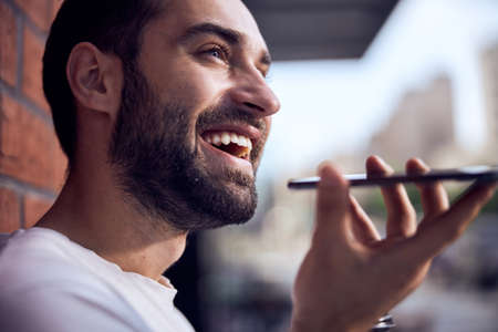 young man with mobile phone sending voice message