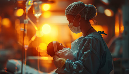 Nurse holding a newborn baby in a hospital, with warm lighting in the background
