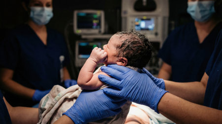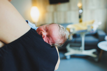 Baby on mothers chest immediately after birth in a hospital. The mother and newborn share a tender moment, emphasizing the bond and emotional connection. The medical staff ensures a safe and caring environment
