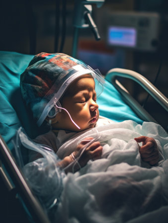Futuristic baby in a glass capsule surrounded by digital circuits, showcasing technology and innovation in a sci fi concept