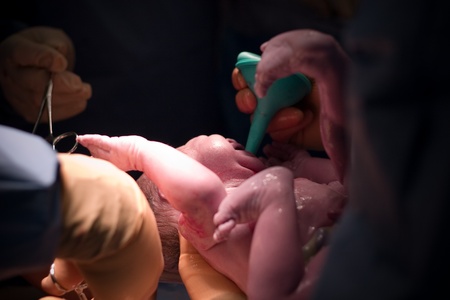 Close up of a newborn baby being held by a doctors gloved hands just after birth. The scene is in a hospital with medical staff in the background.