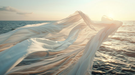 Translucent thin fabric fluttering in the wind. Abstract wavy background. AI generated.