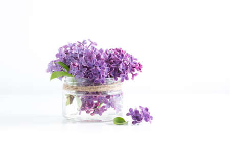 Lilac flowers on a light background. A bunch of lilac flowers. A blooming branch of lilacs.