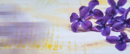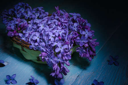 bouquet of purple lilac flowers on a blue wooden plank background. with space for posting information