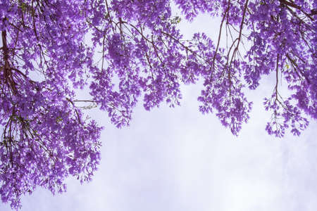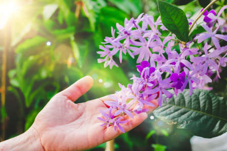 Woman hand touching Queens Wreath Vine or Petrea volubilis purple flowers through sunlight in morning of spring.