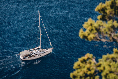 Aerial view of luxury yacht in sea waves and pine branch, maritime cruise in Adriatic Sea, Croatia