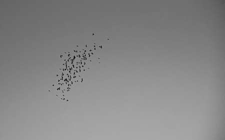 Generic shot of flock of birds in silhouette against blue evening sky
