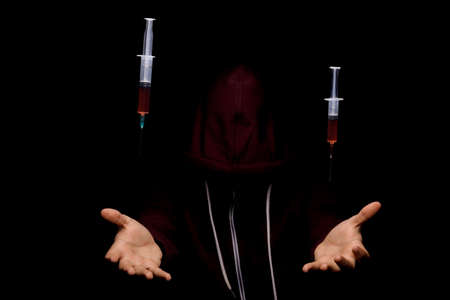 A narcomaniac guy in a dark red hoodie hallucinating in a drug overdose. Young man with drug syringes on a black background. Cocaine, meth, cannabis, LSD, ecstasy, morphine addiction concept.