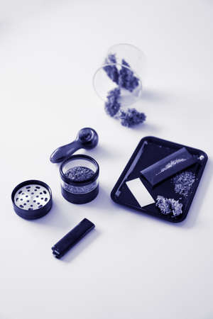 Flat lay of smoking weed accessories. THC use in healthcare.