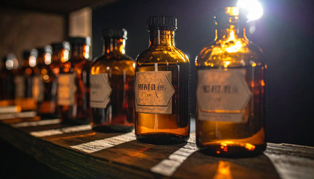 In the quiet, cool darkness of a historic cellar, a collection of fine aged whiskey bottles stands in a silent row.