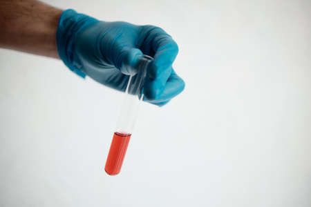 detection of cocaine and heroin: a medical laboratory worker holds in his hand a test tube with a sample of a powder of narcotic substance for analysis, on a white background