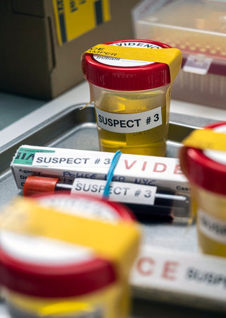 Various analyses of urine, saliva and blood of homicide suspects in crime lab, conceptual image.