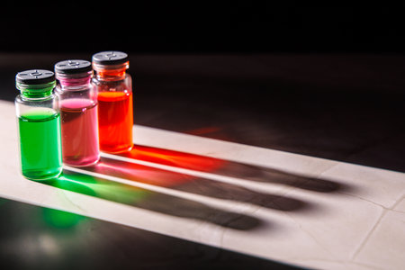 A woman researcher holding chemistry photochemical reaction fluorescent glass vials in a organic laboratory. A copy space black background. Medicinal chemistry laboratory.