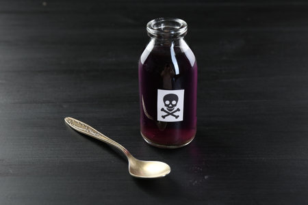 Bottle of poison with warning sign and spoon on black wooden table, closeup