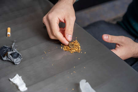 Close up of addict lighting up marijuana joint with lighter. Man rolling a marijuana weed blunt. Man preparing and rolling marijuana cannabis joint. light licks color toned