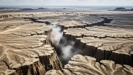 A vast arid landscape with a deep canyon emitting smoke, rocky terrain, and plateaus under a cloudy sky, captured from an aerial viewpoint.