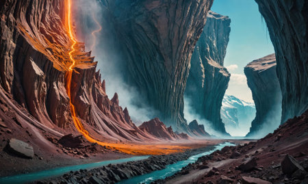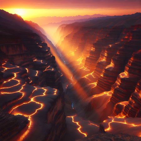 Majestic canyon with rivers of molten gold glowing against red rock walls