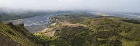 Panoramic breathtaking view from top of Valahnukur mountain on landscape of green valley of Thorsmork with river Krossa delta, volcanos, glaciers and green forest. Foggy summer day, Highlands of Iceland