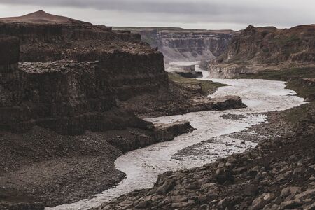 Dramatic view of Jokulsa a Fjollum river canyon in cold and gray autumn weather. Amazing nordic landscape. Popular Icelandic tourist landmark.
