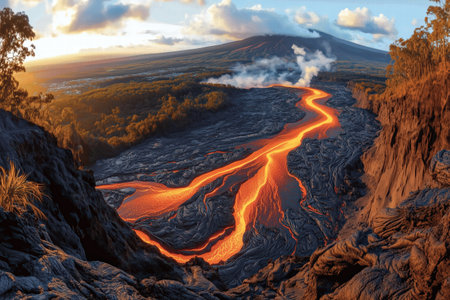 lava flows cascading down the side of a volcano, forming new landscapes, created with generative ai