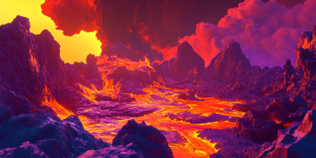 volcano red lava illustration magma flow, molten landscape, destruction vibrant volcano red lava