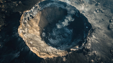 Aerial top view of a volcanic caldera with a steaming fumarole and surrounding rugged landscape