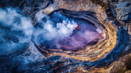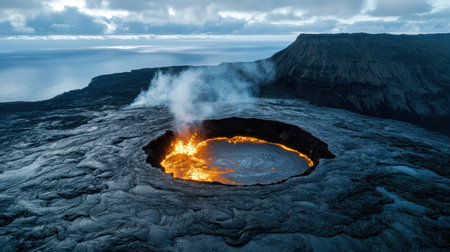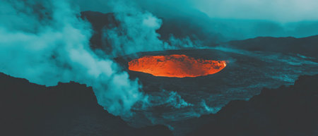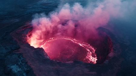 Breathtaking view of volcanic crater shrouded in mist and steam, showcasing rugged terrain and dramatic geological features. atmosphere is filled with sense of awe and natural power