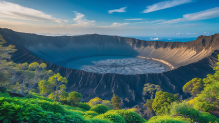 AI Generated. Majestic volcanic crater surrounded by lush greenery and blue skies in a remote landscape