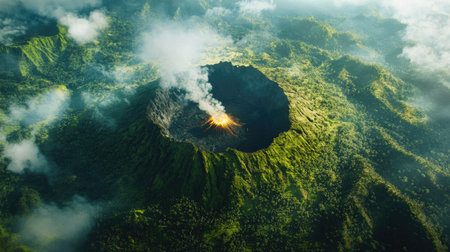 The striking aerial view reveals a volcanic crater filled with steam, nestled among vibrant greenery. This dramatic landscape showcases nature's raw power and beauty amidst solitude.